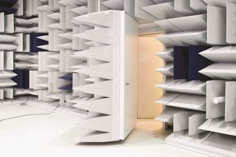 Read moreComprises the low and high-frequency absorbing wedges (yellow pyramids) on walls and ceiling, which minimize sound wave reflections to eliminate echoes and standing waves, creating a near-free-field acoustic environment.